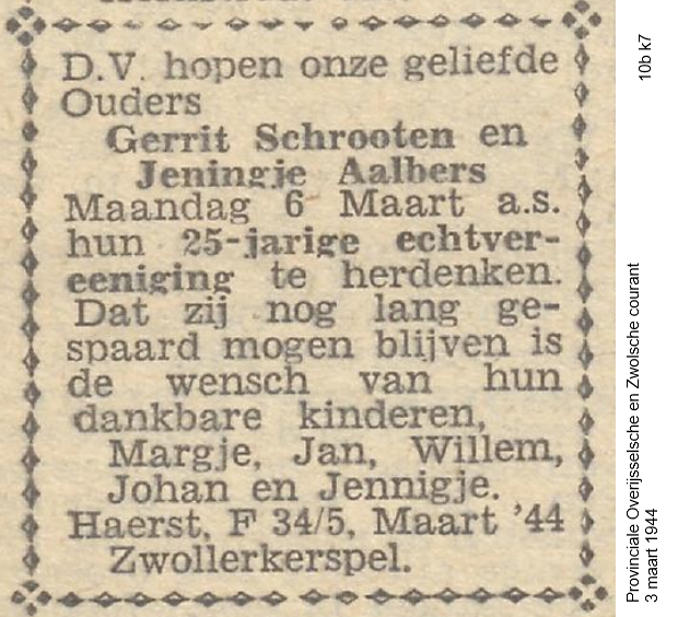 | vr 3 mrt 1944 | Provinciale Overijsselsche en Zwolsche Courant | Familiebericht | Aalbers, Jennigje |